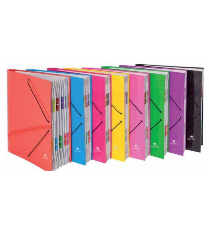 Carpeta fuelle acordeon 12 bolsas, alfabético y numérico. Carton forrado plastificado brillo cierre goma. 8 colores surtidos. 35x25 cm.