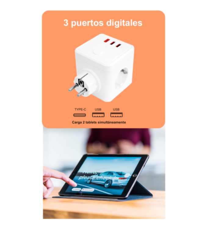 Puerto de Salida 3 x Enchufe schuko + 3 x USB