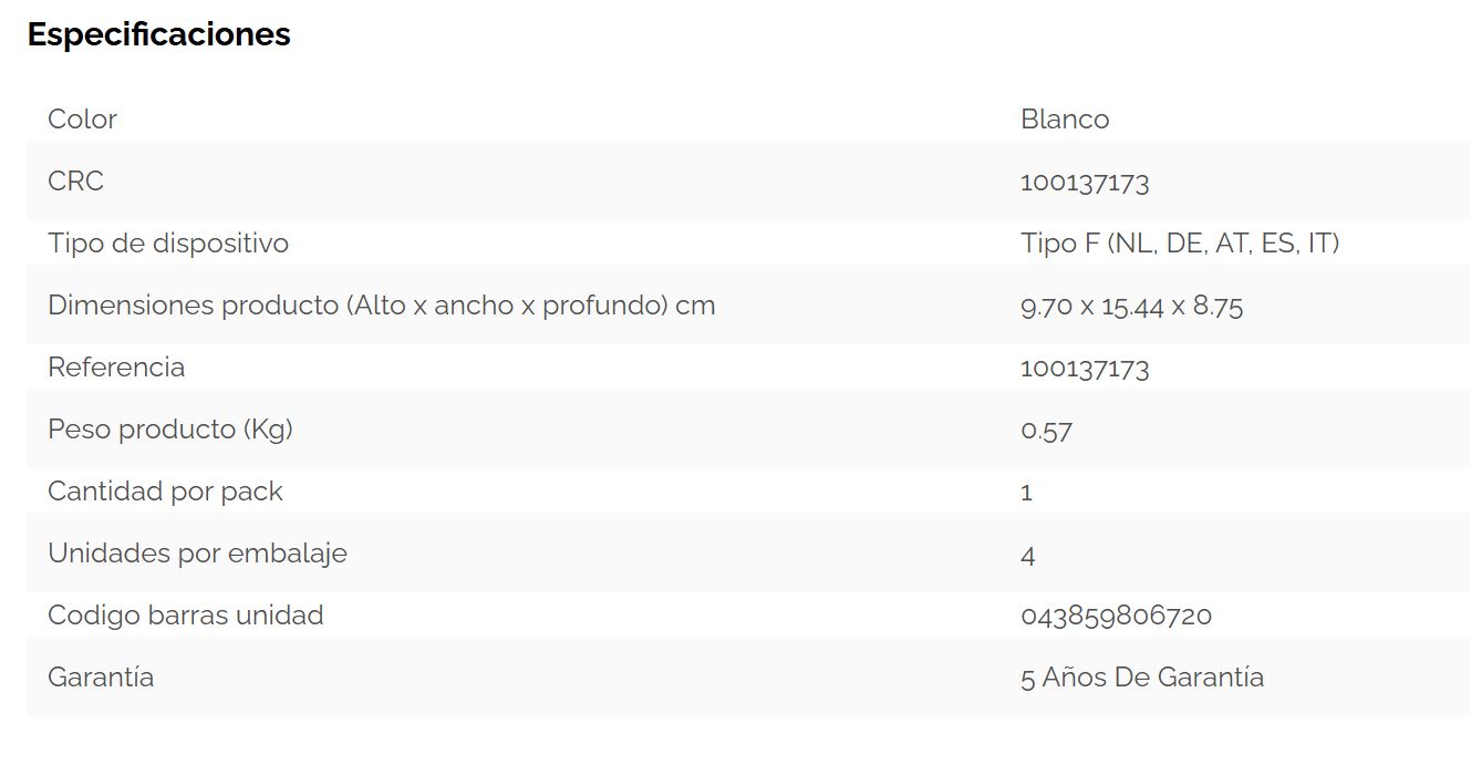 • Equipada con 1 toma de corriente (230 V), 1 puerto USB-A (18 W máx.) y 1 puerto USB-C (30 W máx.).