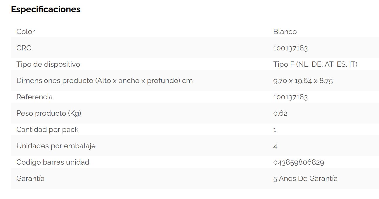 • Equipada con 1 toma de corriente (230 V), 1 puerto USB-A (18 W máx.) y 1 puerto USB-C (30 W máx.).