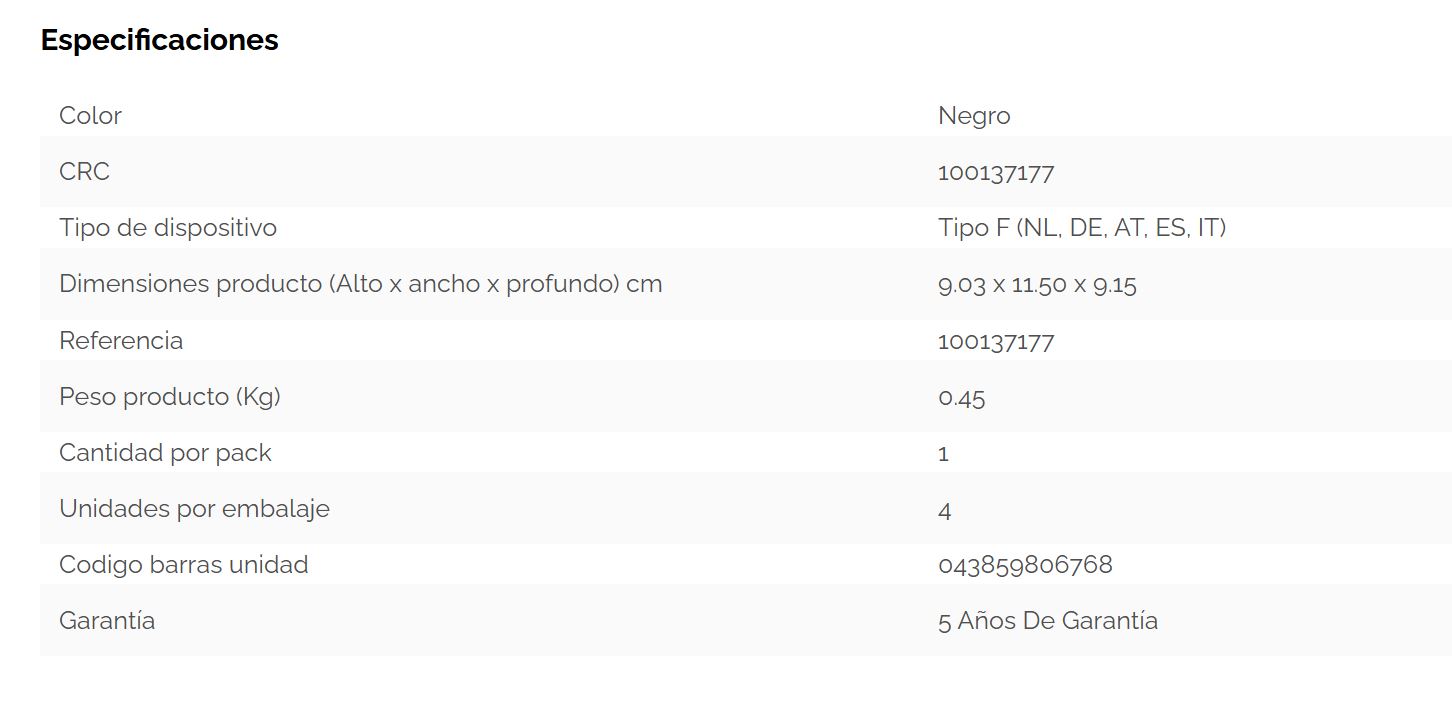 • Incluye 1 toma de corriente (230 V), 1 puerto USB-A (18 W máx.) y 1 puerto USB-C (30 W máx.).