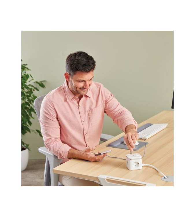 • Su forma cúbica reduce la acumulación de enchufes y deja más espacio para los dispositivos.