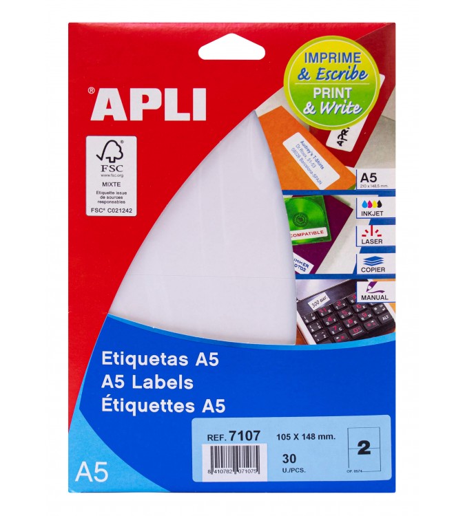 Etiquetas blancas cantos rectos en formato A5, tamaño 105 x 148 mm con adhesivo permanente. Pack con 15 hojas (30 etiquetas). Perfectas para identificar, marcar precios, señalizar, clasificar... Excelente calidad de impresión en impresoras inkjet, láser o fotocopiadoras, así como para escritura manual.