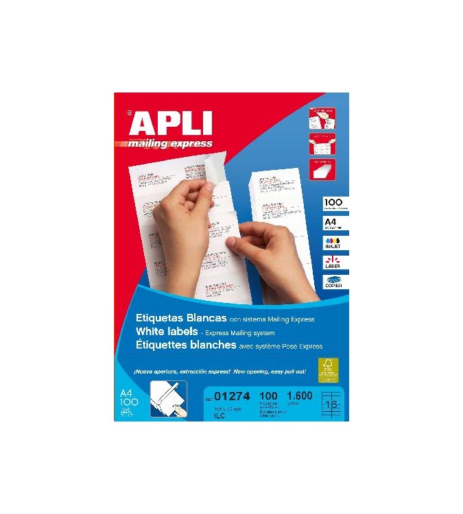 Etiquetas blancas para impresora inkjet, láser y fotocopiadoras a4 adhesivo permanente, cantos rectos caja de 100 hojas