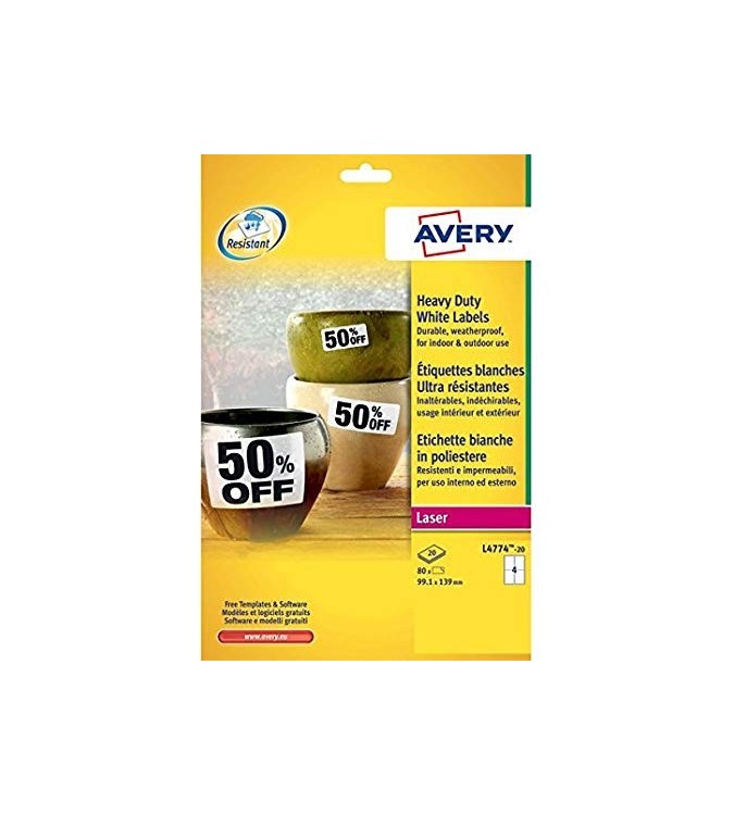 ETIQUETAS AVERY A4 POLYESTER BLANCO 99,1x139 MM C.ROMOS LASER CAJA 20H  80 UDS