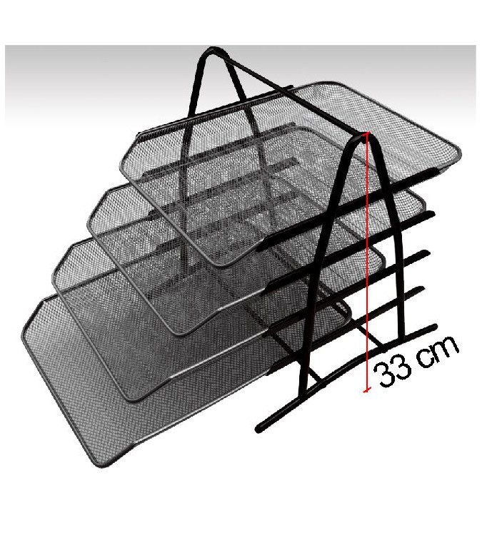 | Bandeja de sobremesa fabricada en metal de rejilla muy resistente. Para documentos A4. Con soporte y asa para transportar el conjunto de las bandejas. 4 bandejas en escalera para acceder fácilmente a los documentos. Color negro. |