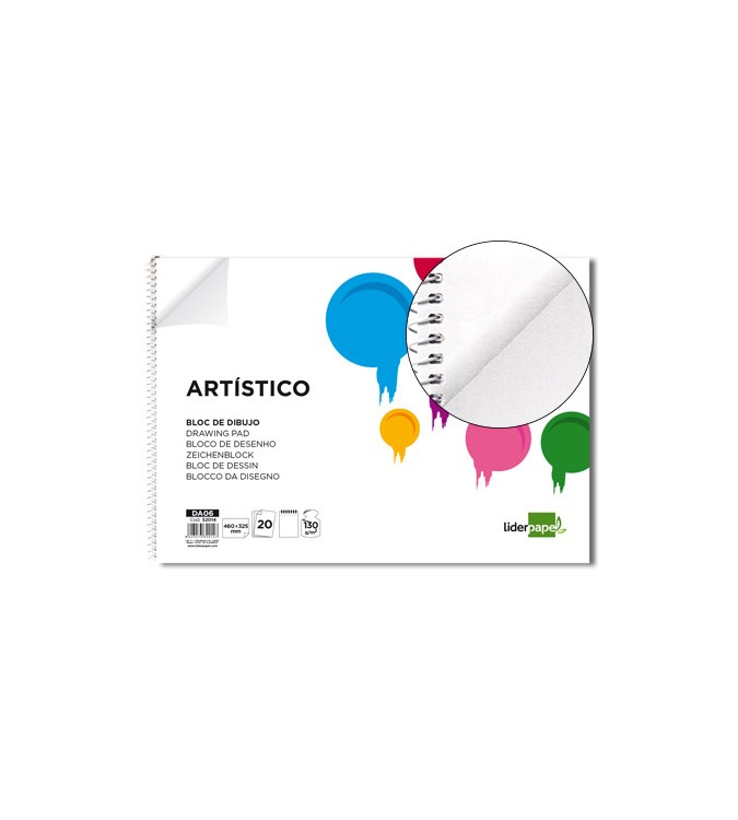 Bloc dibujo liderpapel artistico espiral 460x325mm 20 hojas 130g m2 sin recuadro. 20 hojas. 130 g/m2. Papel blanco, microperforado. Su cuerpo y textura lo hacen adecuado para lápiz, grafito, ceras y colores. Sin recuadro.