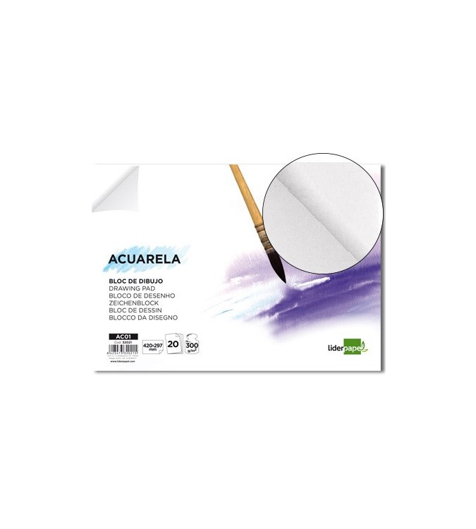 Bloc dibujo liderpapel acuarela encolado 210x297mm 20 hojas 300g/m2 sin recuadro. |