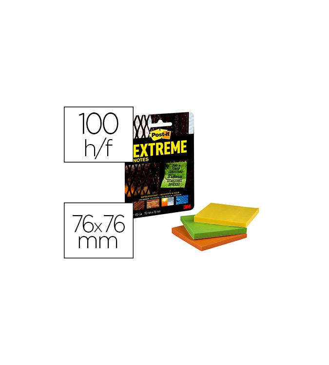 Bloc de notas adhesivas de quita y pon. Pega sobre superficies rugosas incluso en las condiciones más difíciles. Resistentes al agua. Se pueden usar en interior o exterior, en entornos fríos y cálidos. Colores: amarillo, naranja y verde. Medidas: 76 x 76 mm. Pack de 3 unidades de 45 hojas cada uno