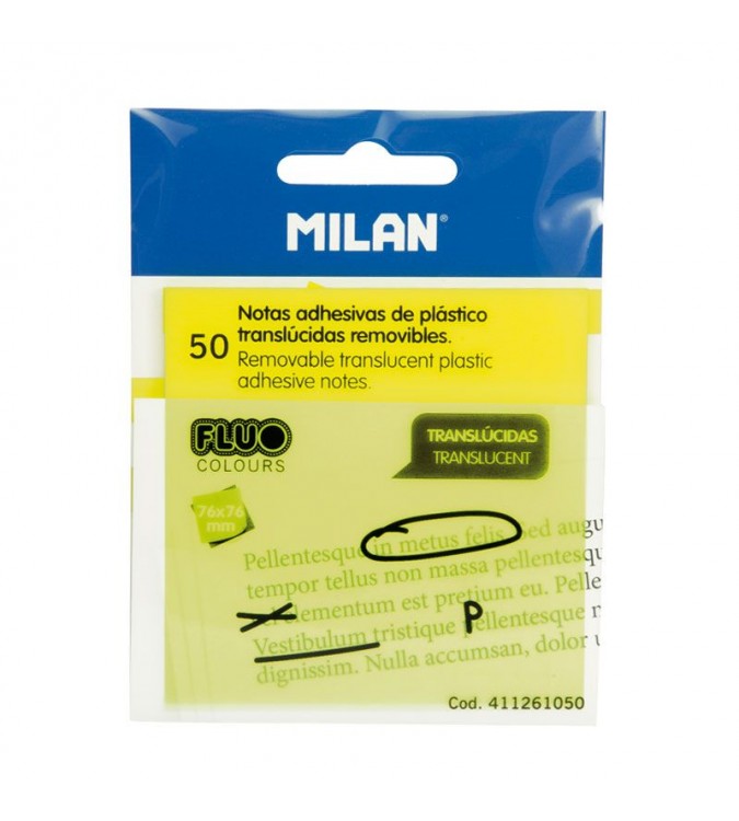 NOTAS ADHESIVAS DE PLASTICO MILAN 76X76 AMARILLO FLUOR TRANSLUCIDO 50 HOJAS