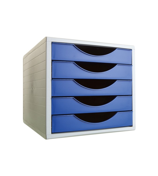 Modulo 5 cajones. Fáciles de apilar con el apilamiento de unos sobre otros. Cajones con tope de seguridad que evita que se caigan al abrirlos. Válidos para formatos A4, folios y subcarpetas.