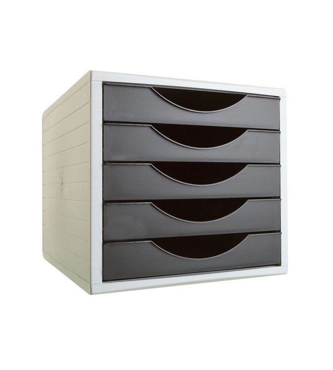Modulo 5 cajones. Fáciles de apilar con el apilamiento de unos sobre otros. Cajones con tope de seguridad que evita que se caigan al abrirlos. Válidos para formatos A4, folios y subcarpetas.