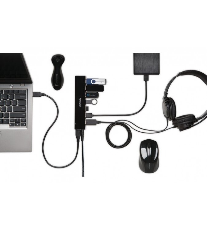 Amplíe las capacidades de productividad de su dispositivo enchufando sus accesorios periféricos en cualquiera de los siete puertos USB 3.0 y verá cargarse al mismo tiempo la batería del smartphone o la tablet con los 1,5 A de corriente que suministra.
