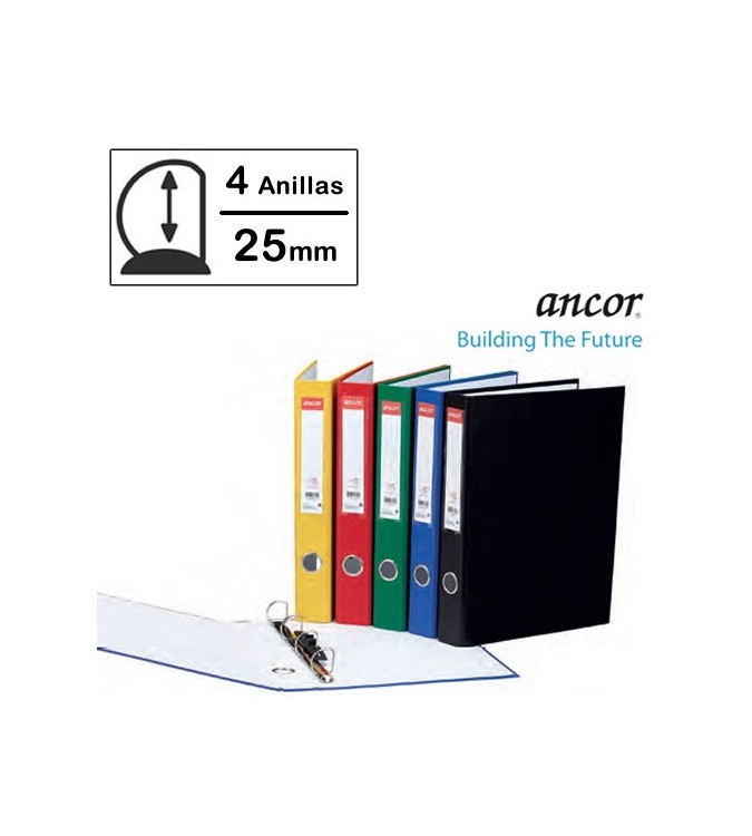 Carpetas con 4 anillas de 25mm tamaño folio 330 X 260 X 45mm, forradas en polipropileno con tarjetero en el lomo y compresor de plastico