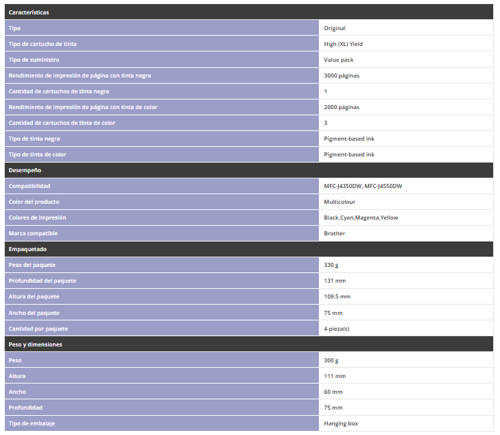 3.000 pags/negro y 2.000 pags/color Impresoras relacionadas: MFCJ4350DW, MFCJ4550DW