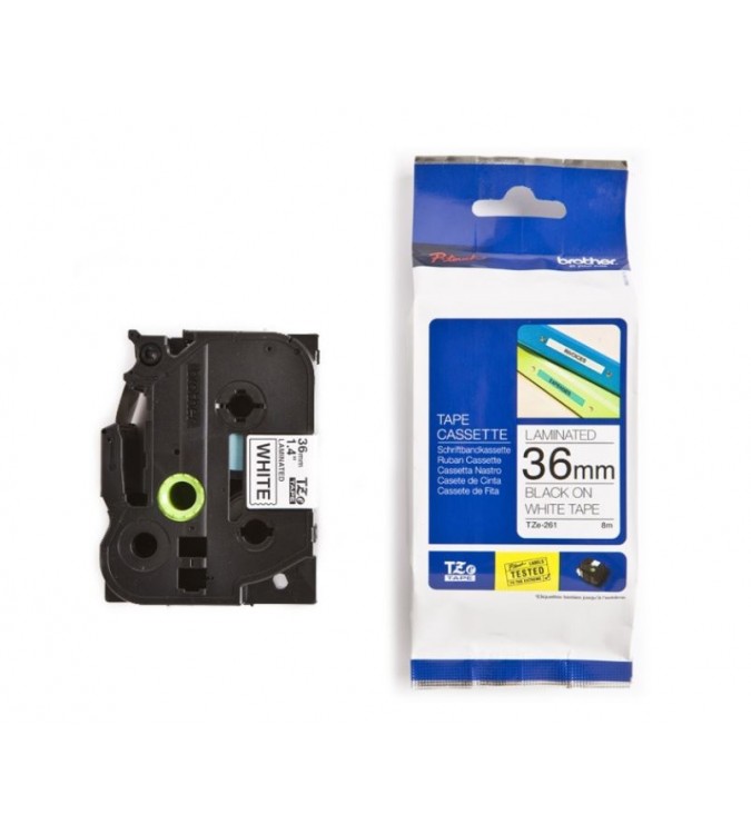 Cinta laminada. Texto negro sobre fondo blanco. Ancho: 36 mm. Longitud: 8 m