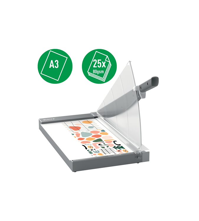 La guillotina de papel Leitz Precision Office A3 es perfecta para el uso general en la oficina para cortar papel, etiquetas, películas, fotos, hojas plastificadas, tarjetas y cartón de montaje. Esta potente y robusta guillotina de papel comercial cortará sin esfuerzo hasta 25 hojas de papel A3 (80grs) con velocidad y precisión. Cuenta con la exclusiva tecnología de luz EdgeGlow que ilumina el filo de corte para una mayor visibilidad y máxima precisión. La abrazadera de papel manual y transparente mantiene el papel seguro, mientras que el mango ergonómico garantiza un corte cómodo y fácil. Es rápido y fácil alinear el papel con las sencillas directrices en la superficie de trabajo lisa y de cristal. El seguro de la hoja de corte ofrece una protección total y el pestillo de seguridad mantiene la hoja de corte bloqueada mientras no se utiliza. Con una cuchilla de acero inoxidable de alta calidad, una superficie de trabajo resistente y una garantía ampliada de 5 años, tendrás la tranquilidad de que esta guillotina A3 te proporcionará un corte preciso durante muchos años.