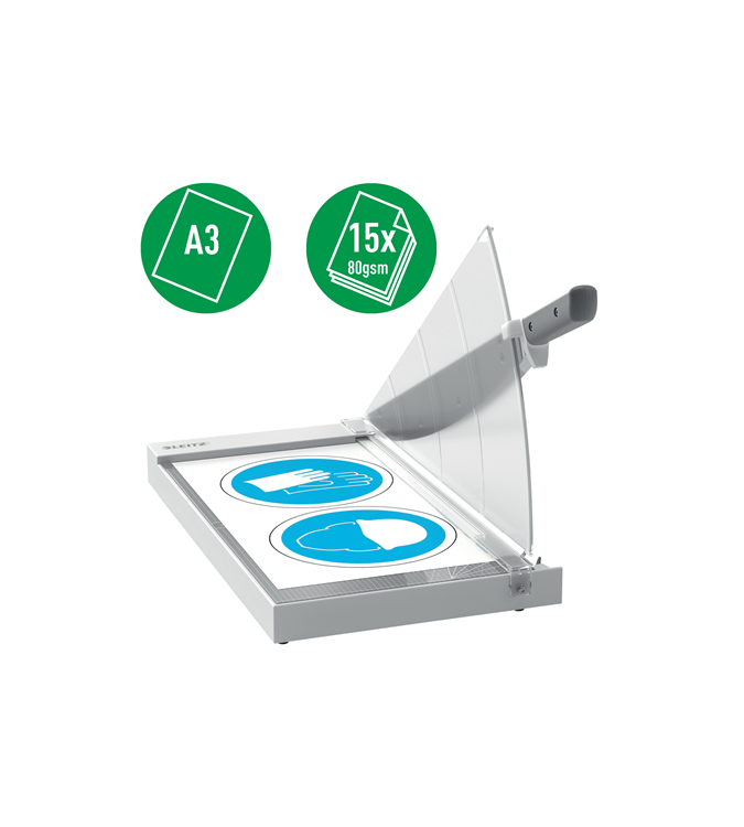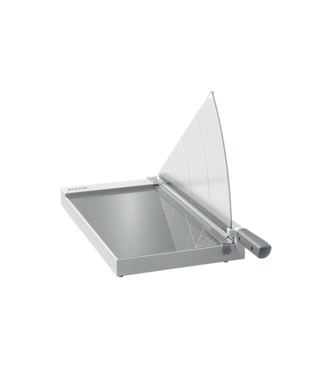 La guillotina de papel Leitz Precision Office A3 es perfecta para el uso general en la oficina para cortar papel, etiquetas, películas, fotos, hojas plastificadas, tarjetas y cartón de montaje. Esta potente y robusta cortadora de papel de oficina cortará sin esfuerzo hasta 15 hojas de papel A3 (80grs) con velocidad y precisión. Cuenta con la exclusiva tecnología de luz EdgeGlow que ilumina el filo de corte para una mayor visibilidad y máxima precisión. La abrazadera de papel manual y transparente mantiene el papel seguro, mientras que el mango ergonómico garantiza un corte cómodo y fácil. Es rápido y fácil alinear el papel con las sencillas directrices en la superficie de trabajo lisa y de cristal. El seguro de la hoja de corte ofrece una protección total y el pestillo de seguridad mantiene la hoja de corte bloqueada mientras no se utiliza. Con una cuchilla de acero inoxidable de alta calidad, una superficie de trabajo resistente y una garantía ampliada de 5 años, tendrás la tranquilidad de que esta guillotina A3 te proporcionará un corte preciso durante muchos años.