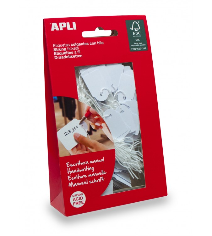 Etiquetas colgantes blancas tamaño 36 x 53 mm. Cada caja contiene 100 etiquetas con hilo. Estas etiquetas están fabricadas en cartulina de 200 g/m², con un agujero preperforado e incluyen, cada una, un hilo de poliéster blanco ajustable a la medida deseada. Aptas para escritura manual con lápiz, bolígrafo (incluso de tinta gel), rotuladores, permanentes, tinta de sello, etc. Ideales para usar en regalos, detalles de bodas, fiestas, álbumes, productos artesanales, folletos, almacenamiento, poner precios, tintorerías, etc