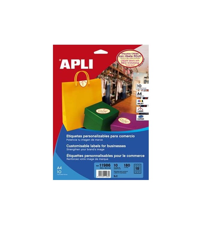 Etiquetas apli de comercio personalizables para inkjet, láser y fotocopiadoras, color crema con ribete rojo, cantos ovalados, adhesivo permanente, carpeta 10 hojas a4