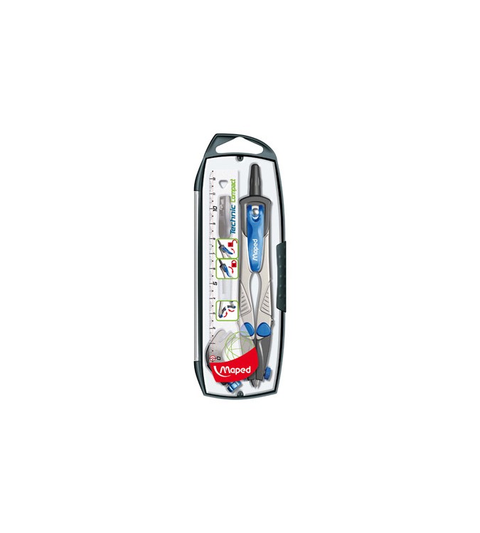 Compás con caja antichoque. Los brazos son articulables, además de poseer un bloqueo para más comodidad en el trazo. Círculo máximo: 360 mm., 500 mm con prolongador y longitud de 150 mm. La caja dispone de 1 compás mina, 1 abrazadera universal, 1 afila minas y 1 estuche de minas.