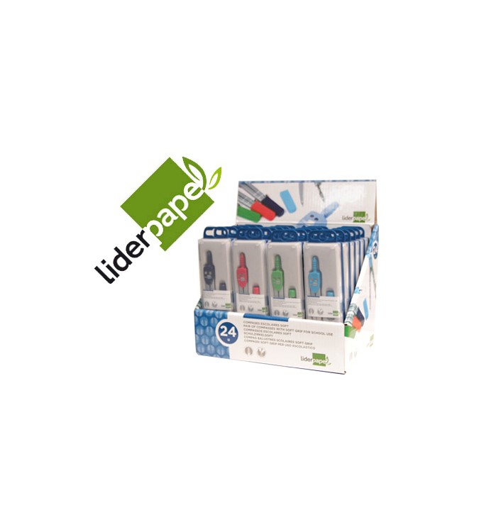 Compas liderpapel con mango extra soft -colores surtidos. Mango extra suave. Con protector de punta para evitar pinchazos y mina de2 mm de repuesto. Longitud: 12 cm. Se presenta en estuche de plástico transparente y de color. Colores surtidos: azul, celeste, rojo y verde. Circunferencia: 36 cm.