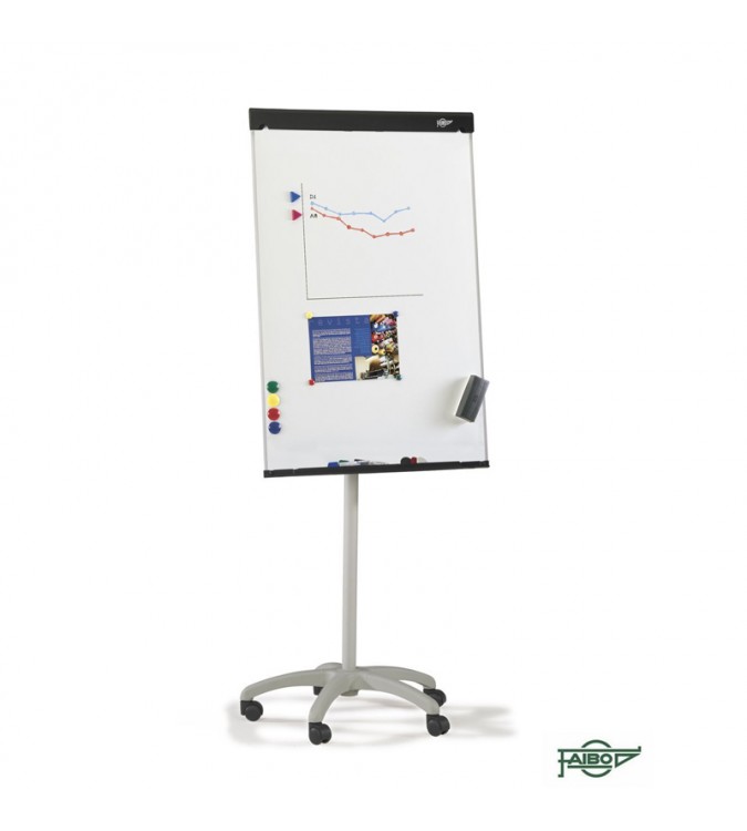 Base con ruedas, todas ellas con freno. Superficie de escritura metálica, que permite escribir con rotuladores especiales para pizarra blanca de borrado en seco y el trabajo con imanes. Con pinza que permite la colocación de un bloc, bandeja para rotuladores y borrador. Graduable en tres alturas, en 180, 192 y 204 cm.