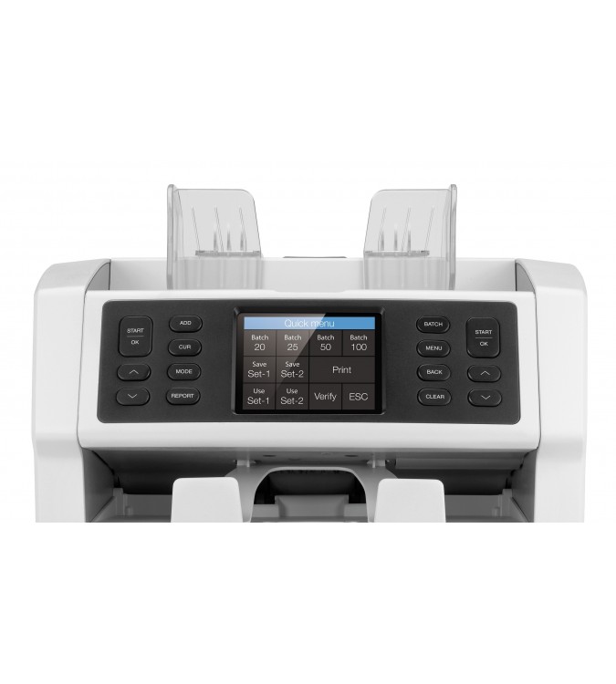 El menú rápido es una herramienta útil que ofrece varias funciones como ajustes predeterminados de fajos y guarda los ajustes de conteo usados más a menudo para dos operadores, impresión y una función de verificación. El menú rápido es fácil de acceder a través de la gran pantalla TFT de 3,2 " en color.