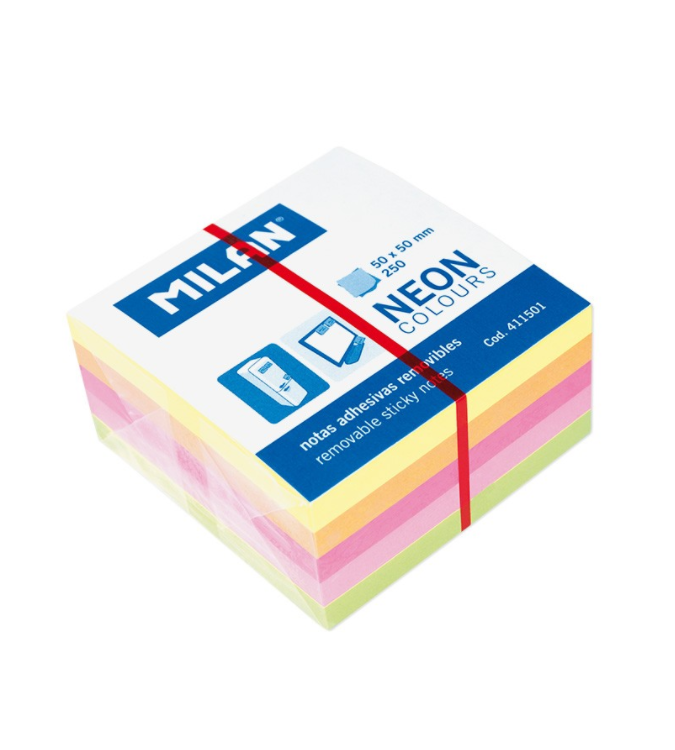 Notas adhesivas removibles mini en colores Fluo. 50 hojas de cada color: amarillo, naranja, coral, rosa y verde. 50 x 50 mm.