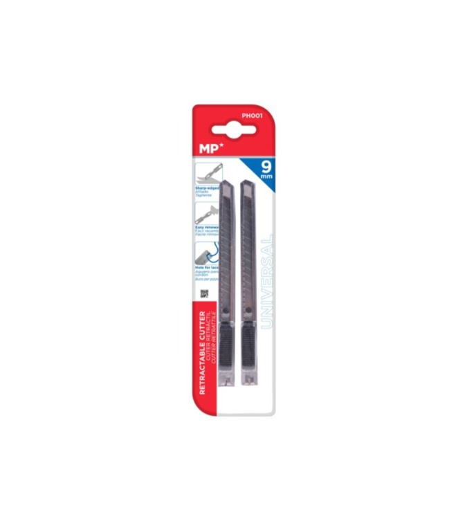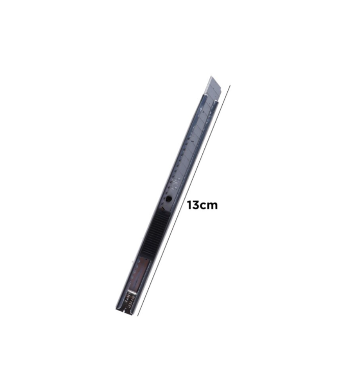 Cúter metálico estrecho. Retráctil para guardar la cuchilla y evitar cortes y pinchazos. Las cuchillas son de acero inoxidable precortadas intercambiables. Freno de seguridad. Longitud: 130 mm. Cuchilla de 9 mm de ancho. |