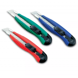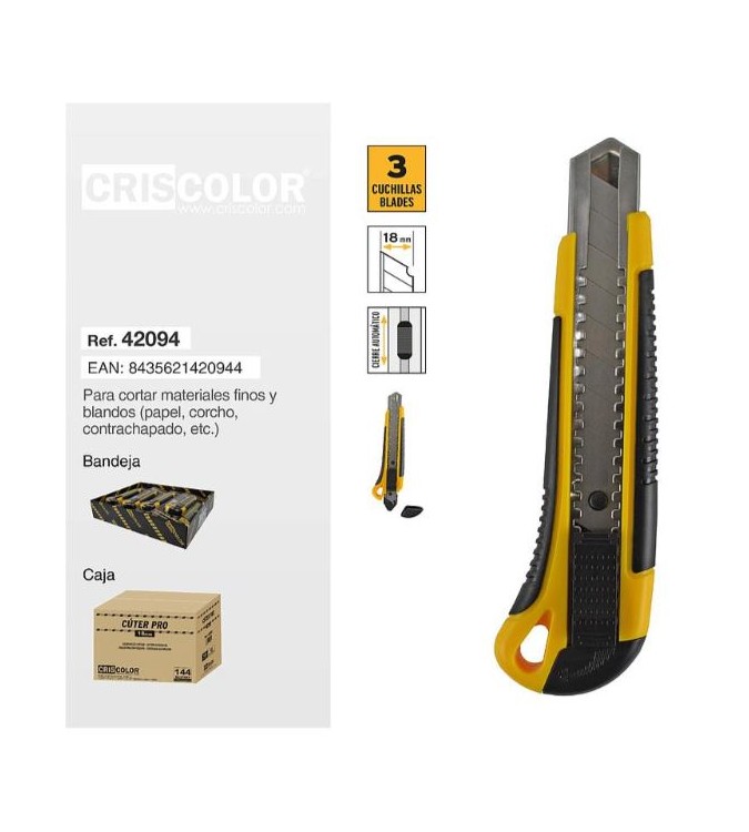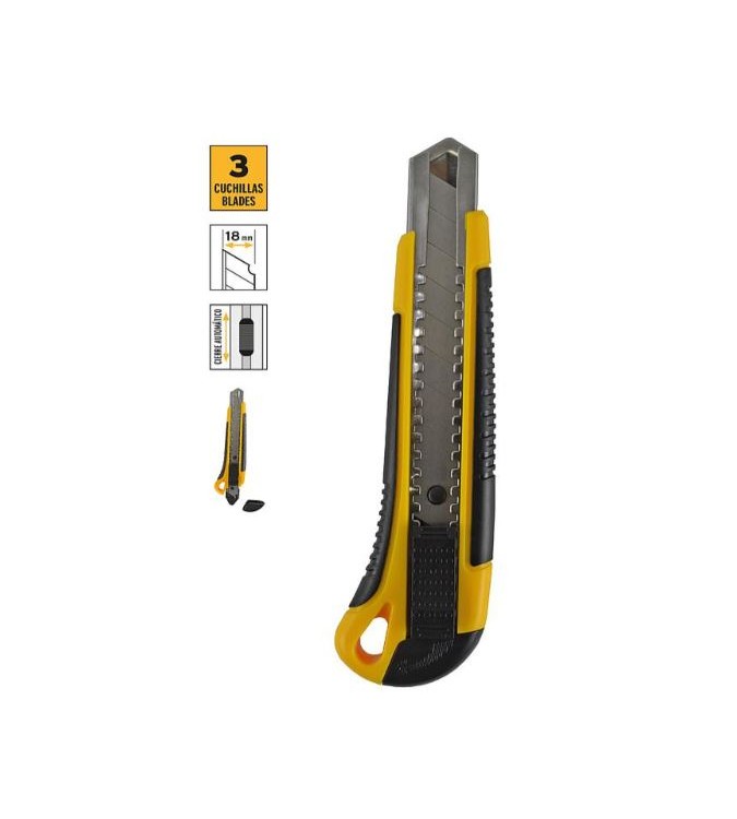 Cuenta con una hoja de 18 mm de ancho, lo que lo hace adecuado para cortar materiales como cartón, moqueta, papel o láminas finas.