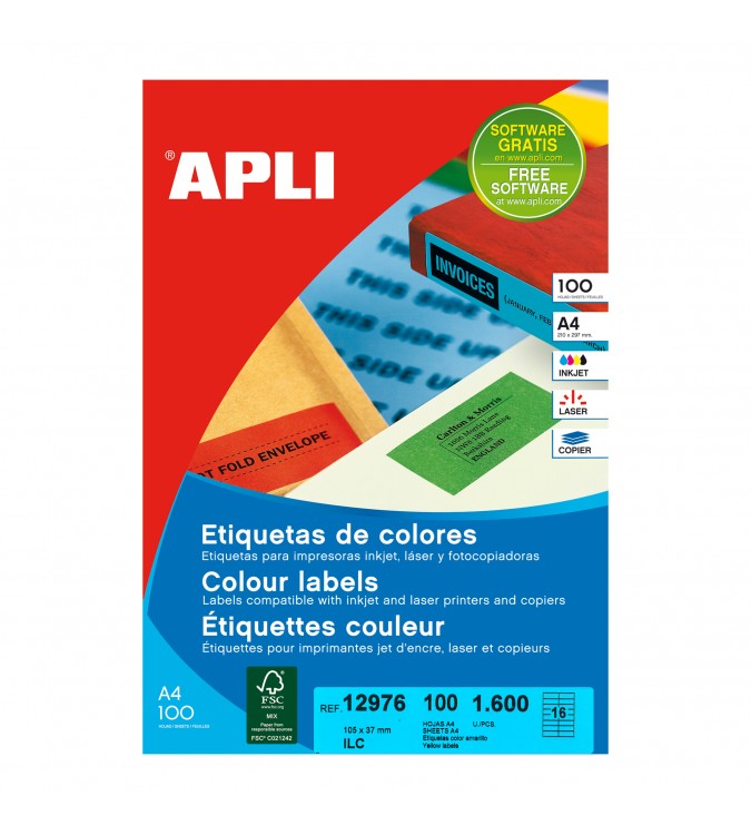 Etiquetas amarillas cantos rectos tamaño 105,0 x 37,0 mm con adhesivo permanente. Pack con 100 hojas (1.600 etiquetas). Las etiquetas de colores son ideales para destacar tu información en un sobre de envío, paquete u objeto. Excelente calidad de impresión en impresoras inkjet, láser o fotocopiadoras.