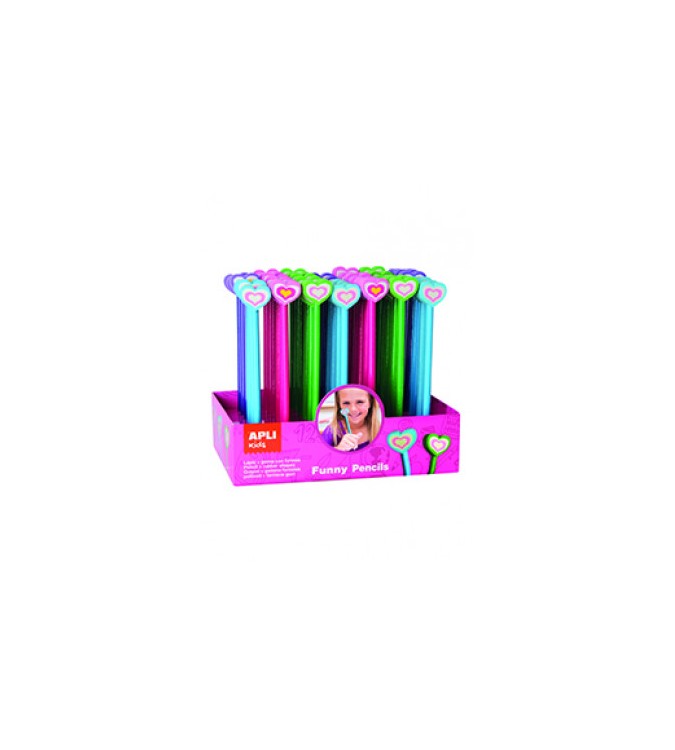 lápices con goma modelo corazones en 3 colores diferentes: rosa, azul y verde. Lápices con mina nº2 y goma de borrar en forma de corazón en el extremo superior.
