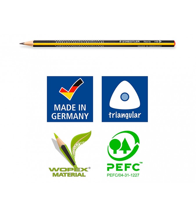 Lápiz de grafito de diseño triangular, fabricado en material ecológico wopex. Dureza hb. Cuerpo a rayas amarillas y negras con diseño de estrellas. Superficie suave y alta resistencia a la rotura. Fabricado con madera procedente de bosques de Alemania. Producto ecológico. |