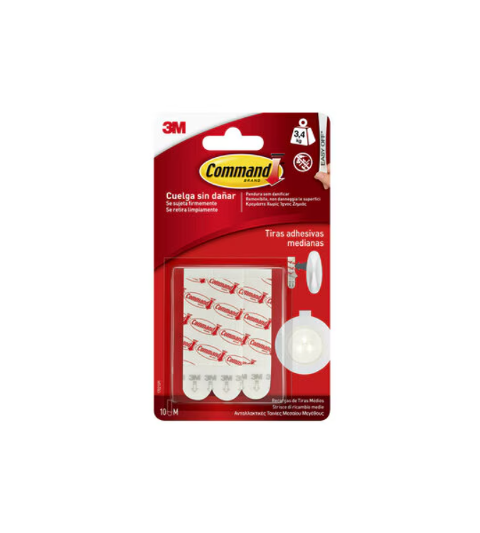 Mueve y vuelve a colgar tus productos Command™ con las tiras de repuesto medianas Command™. Perfectas para todos los ganchos medianos de la gama. Nuestras tiras se sujetan firmemente a distintas superficies, ya sean paredes sólidas, huecas y pintadas. Se retiran fácilmente sin dejar rastro: sin grietas, agujeros, daños en el yeso ni residuos pegajosos. Son perfectas para casas de alquiler en las que te preocupa no dañar las superficies.