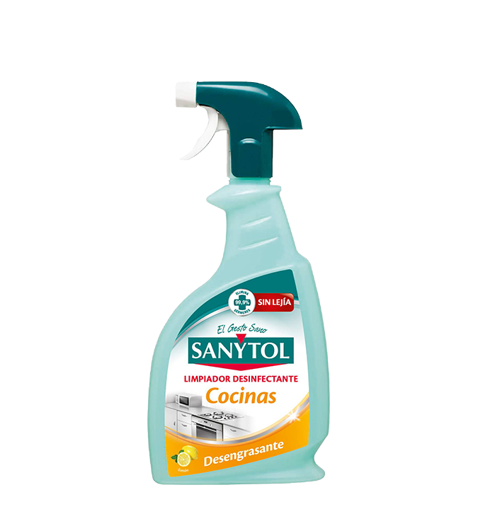 Limpiador desinfectante desengrasante para cocinas que elimina el 99,9% de los gérmenes y hongos. Eficaz contra bacterias como la salmonella, la listeria o el E.coli, presentes en alimentos crudos.