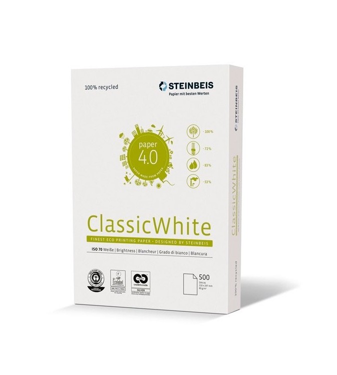 Papel de oficina multifuncional, 100% pasta reciclada.