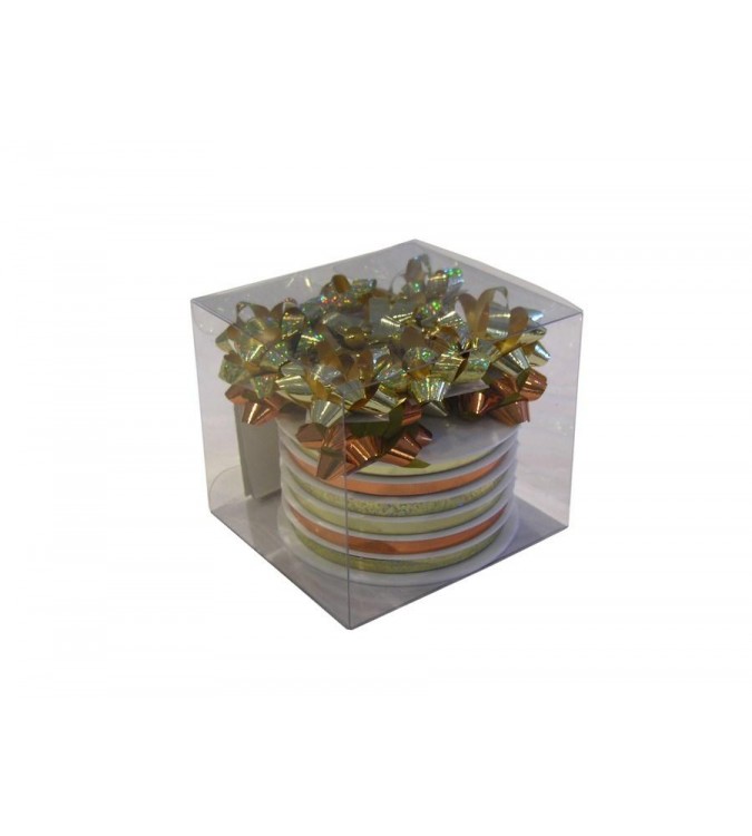 Conjunto compuesto por: un rollo con 6 cintas de regalo de 3 modelos diferentes en colores dorados y cobres, 12 tarjetas de regalo en dorado y 12 moños en dorado y cobre.
