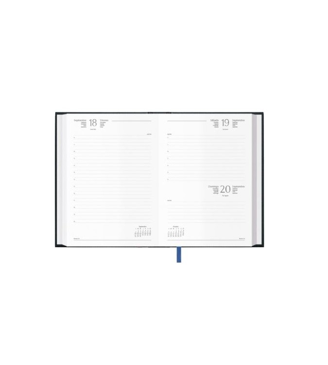 Cubierta realizada en material vinílico con cartón contracolado de primera calidad. Interior con sábado y domingo en la misma página, impresa a un color en papel offset blanco de 70 grs., con 336 páginas.