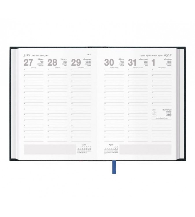 Encuadernación cosida con lomo redondo, cabezada y cinta de registro color AZUL. Bloque 144 páginas, impresas a 1 color, papel Offset Blanco 70 g.