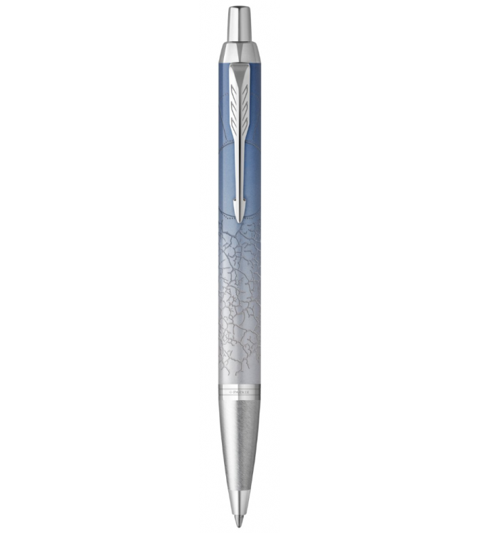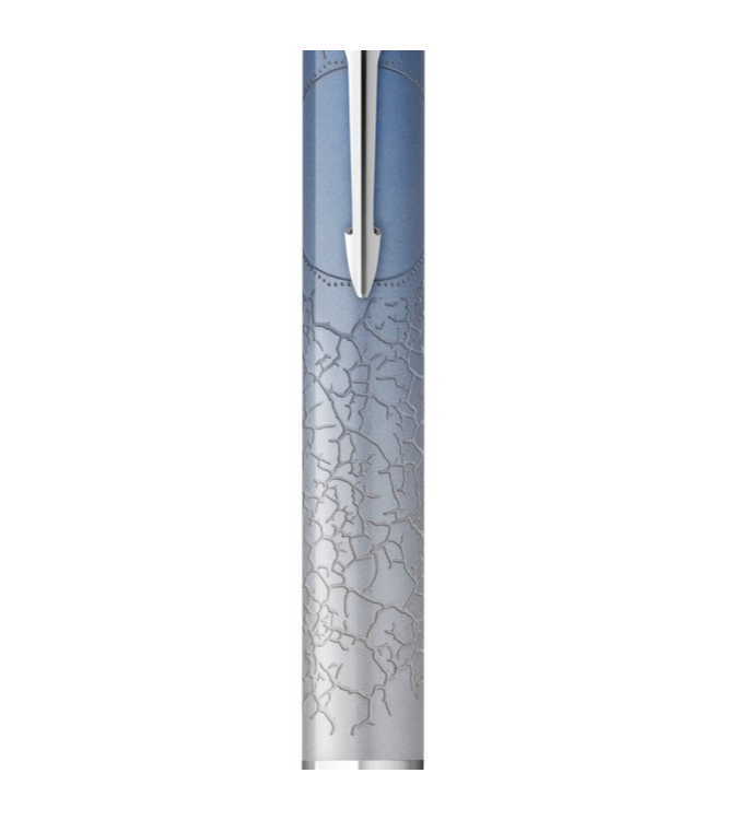 Capuchón y cuerpo lacados en degradado gris con un patrón táctil grabado inspirado en la exploración del Ártico. Complementado con detalles cromados y el exclusivo clip de flecha PARKER