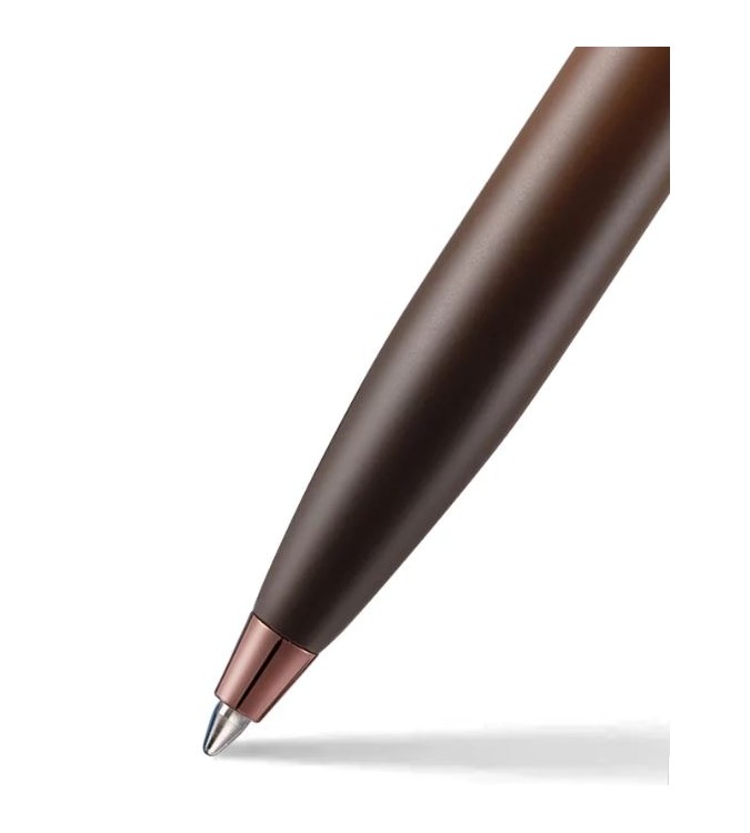 Esta hermosa pluma luce un intenso tono marrón café oscuro, acentuado por una refinada taza y el emblema de un corazón en el capuchón.