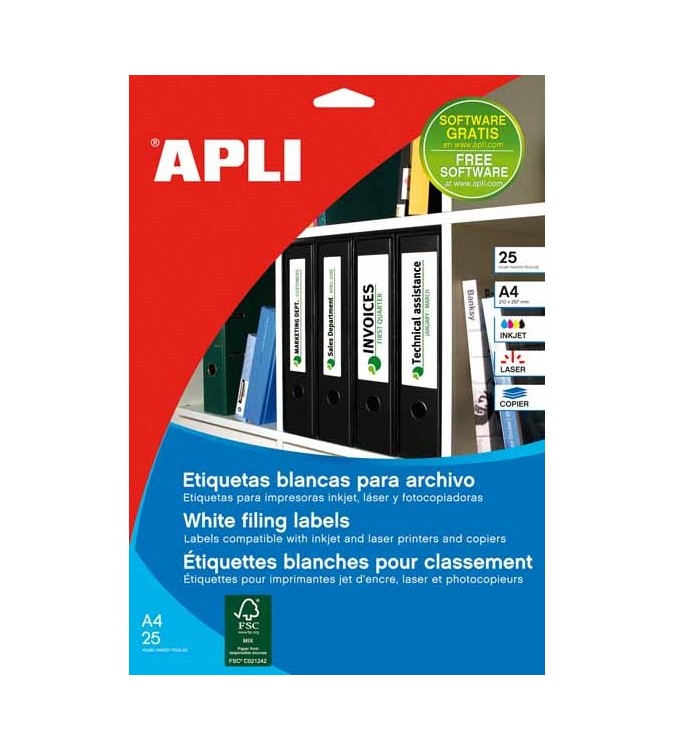 ETIQUETAS PARA LOMO ARCHIVADOR APLI 1232 A4, 190x38 MM. 25 HOJAS 175 ETIQUETAS, INKJET LASER Y FOTOCOPIADORAS