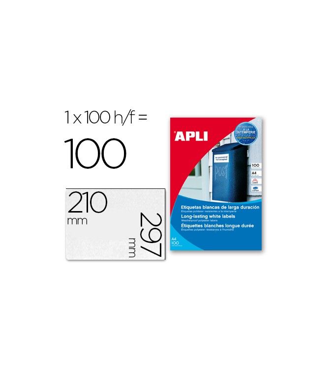 ETIQUETAS ADHESIVAS APLI 12121 TAMAÑO 210X297 MM POLIESTER BLANCAS RESISTENTE A LA INTERPERIE IMPRESION LASER
