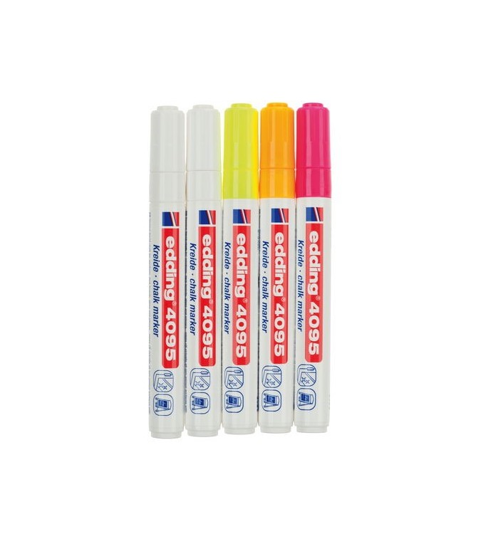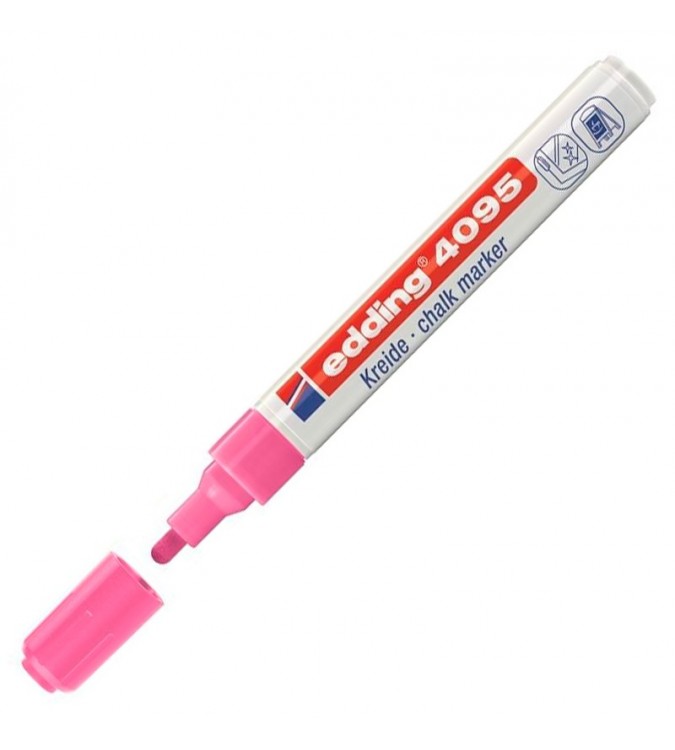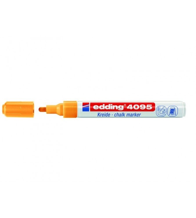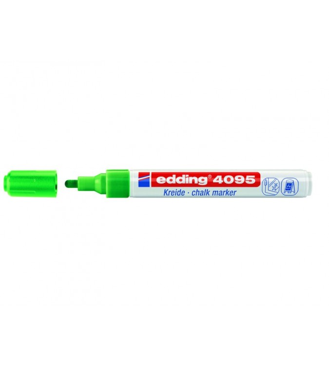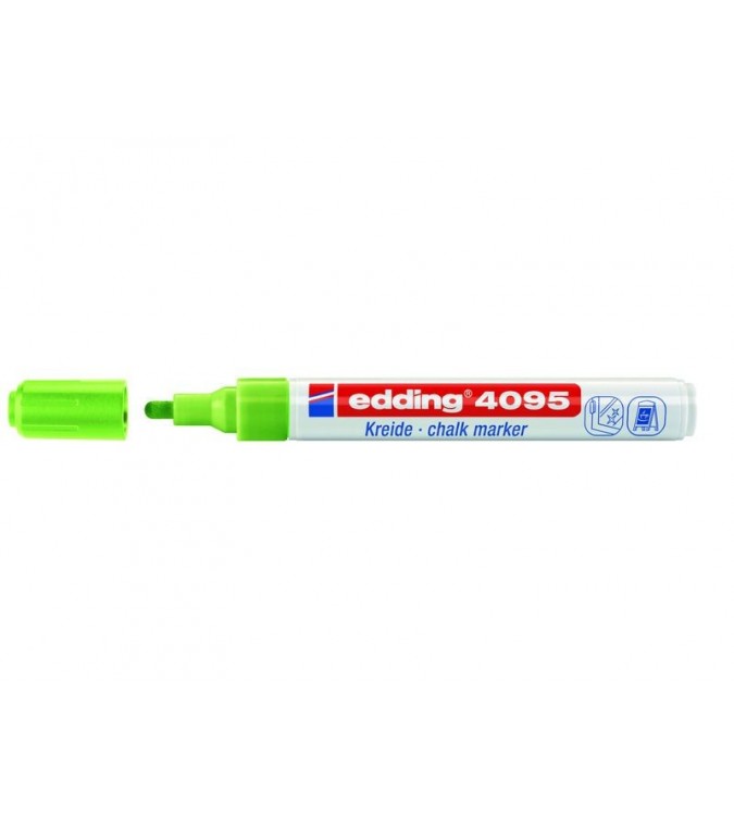 Marcador de tiza líquida Edding 4095 a base de agua que se borra con un paño húmedo en casi todas las superficies no porosas. Ideal para escribir, decorar, pintar y rotular ventanas o pizarras de tiza. Olor neutro. Punta ojival. Trazo: 2-3 mm.