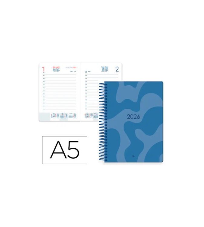 La agenda espiral Liderpapel Syros 2026 en formato 150 x 210 mm con diseño Día Página en color azul es una herramienta práctica y estilizada para la organización diaria. Su tapa rígida forrada con acabado brillo y su encuadernación en espiral aseguran durabilidad y comodidad en el uso, mientras que el papel de 60 gramos certificado FSC garantiza un compromiso con la sostenibilidad y calidad en la escritura.
