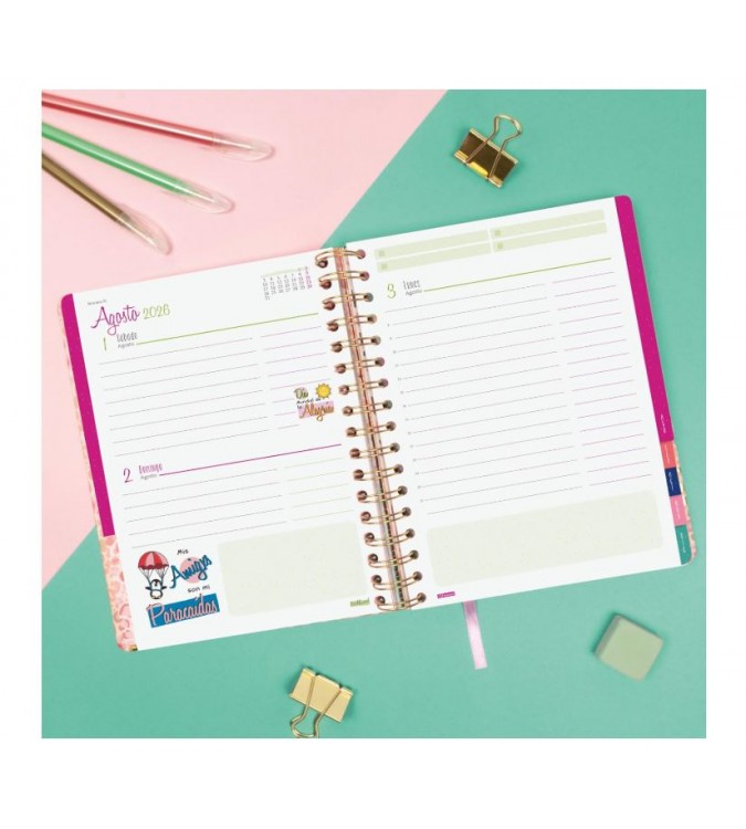 • CONTENIDO: La anualidad de la agenda contiene: festivos, cambios de estación, días especiales y una frase TALKUAL para cada semana. Con planificación mensual cuadriculada y contenido temático intercalados en la anualidad. Al inicio, dispone de contenidos extra: datos personales, identidad #TALKUAL, horarios, calendarios, objetivos, planificación mensual del año en columnas y fechas para recordar. Después de la anualidad: planes, apartados para pelis, series, contraseñas y libros, hojas para anotaciones y tareas, control de notas, listas, contactos y control de ciclos. Y por último: pegatinas temáticas, funda transparente y set de notas engomadas.