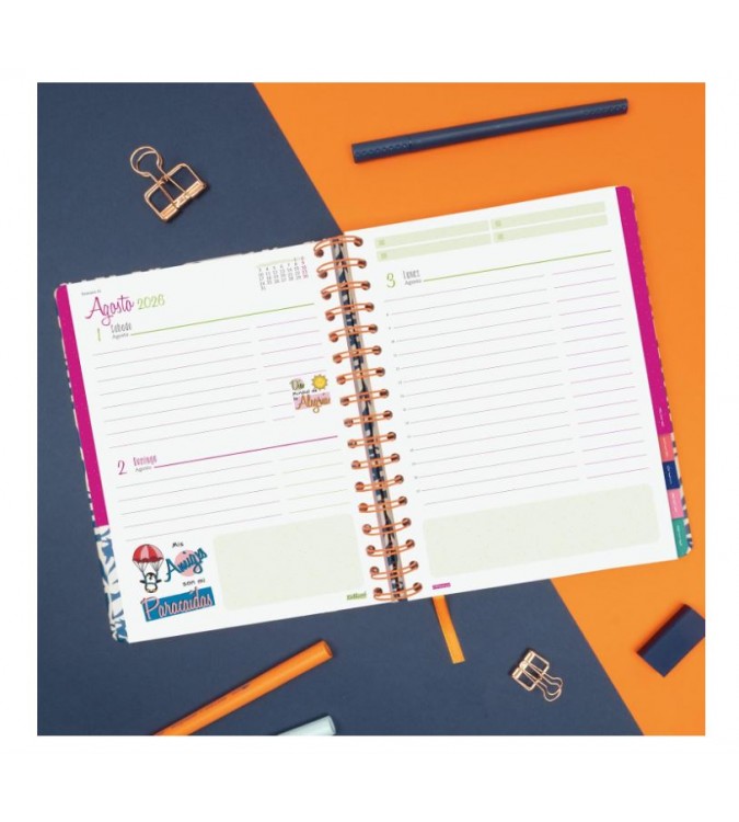 • CONTENIDO: La anualidad de la agenda contiene: festivos, cambios de estación, días especiales y una frase TALKUAL para cada semana. Con planificación mensual cuadriculada y contenido temático intercalados en la anualidad. Al inicio, dispone de contenidos extra: datos personales, identidad #TALKUAL, horarios, calendarios, objetivos, planificación mensual del año en columnas y fechas para recordar. Después de la anualidad: planes, apartados para pelis, series, contraseñas y libros, hojas para anotaciones y tareas, control de notas, listas, contactos y control de ciclos. Y por último: pegatinas temáticas, funda transparente y set de notas engomadas.