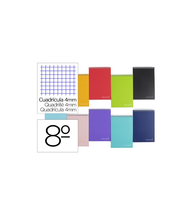 Tapa de cartoncillo de 800 g/m² con doble encolado, impresa y plastificada mate. Gran resistencia y rigidez. Papel de 75 g/m². Espiral nylonizada. Con margen. Coil-lock. Colores surtidos. |