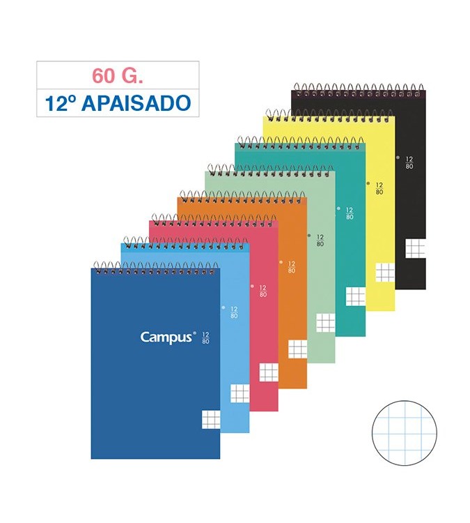 Bloc de espiral de tapa blanda de cartón flexible y ligera. Cubierta 4 colores surtidos. Contraportada blanca. Contiene 80 hojas de 60 gramos. Tamaño: 12º Apaisado. Medidas: 125 x 85 mm. Rayado: cuadrícula 4 mm.